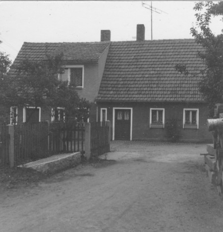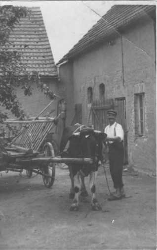 Blick auf Stallgebäude - Opa mit Ochsen und Wagen vor der Heuernte